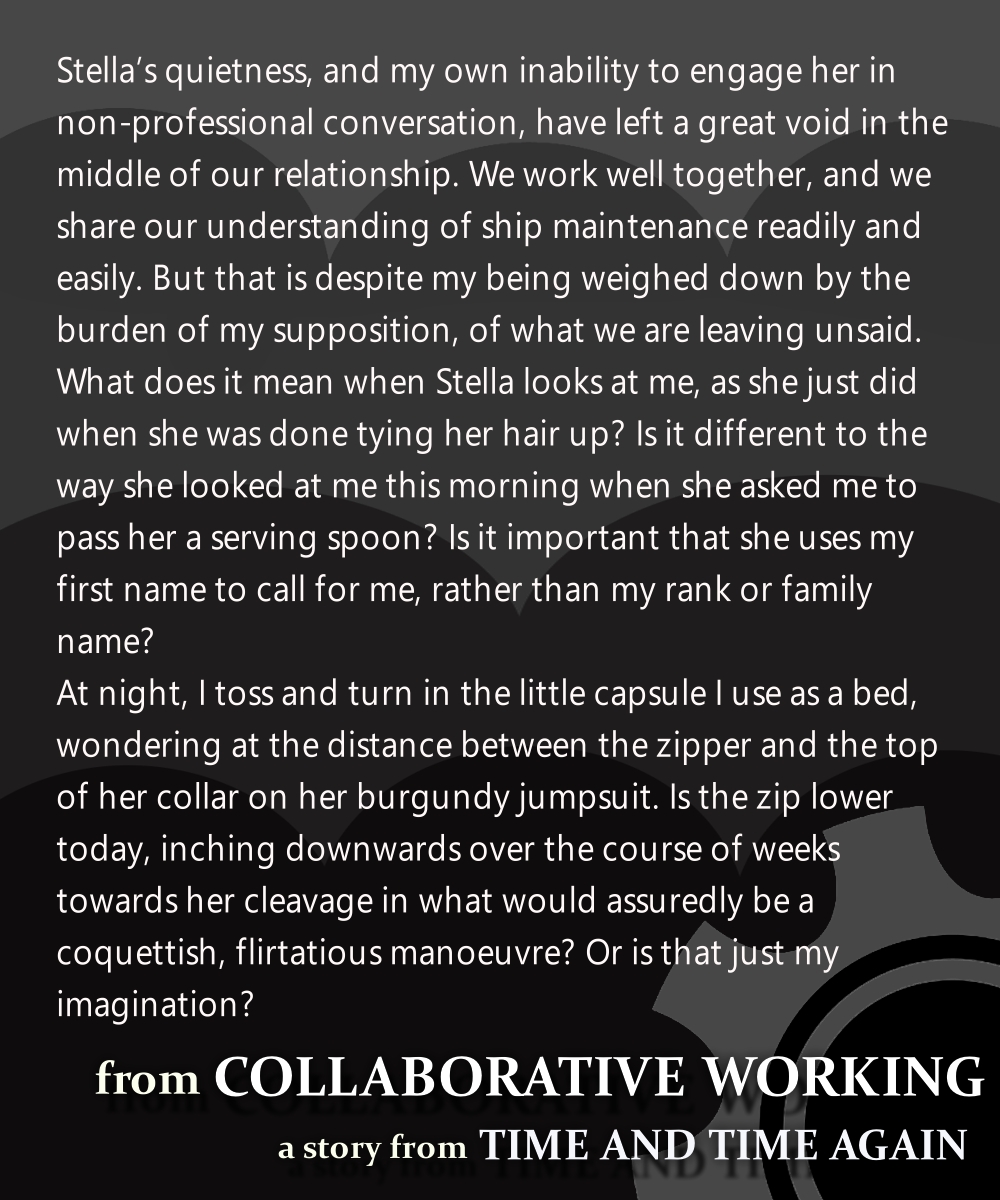 - Collaborative Working (scifi, 4,600 words). Two deep-space couriers share the confines of their lightspeed shuttle, as well as each other.