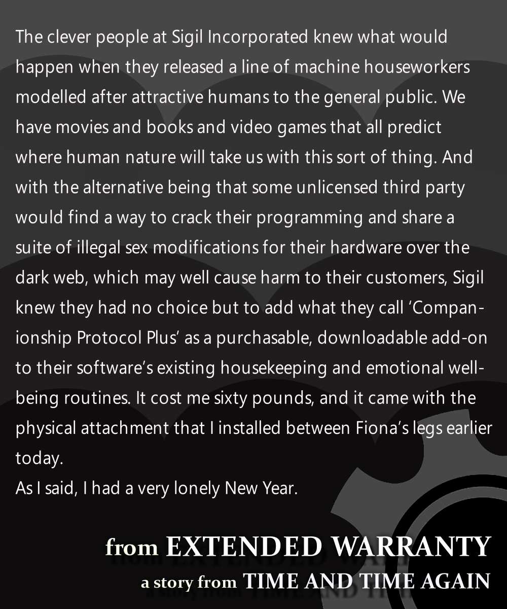 - Extended Warranty (scifi, 4,400 words). The owner of a beautiful android houseservant decides to take a bold step with her.