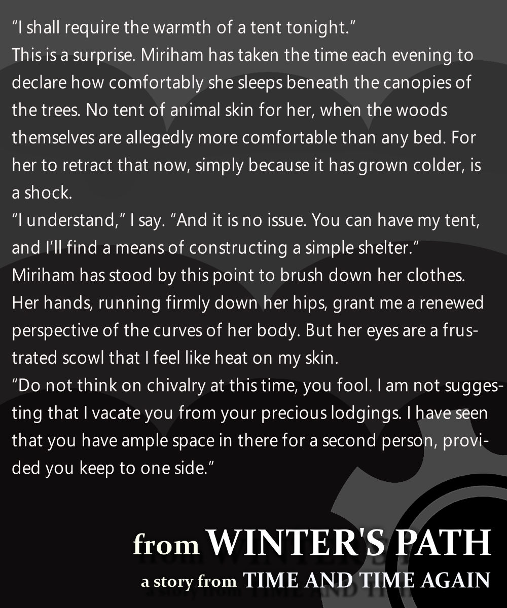 - Winter's Path (fantasy, 7,400 words). A human diplomat and a haughty elf princess huddle for warmth on a shared journey. (Currently being expanded in the Laymen serial!)