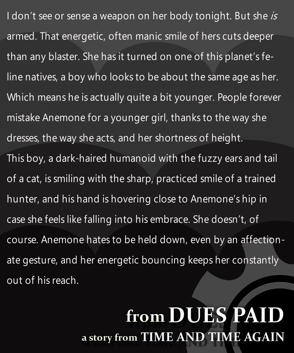 - Dues Paid (scifi, 8,900 words). A bounty hunter finally catches his former partner, seeking vengeance for a betrayal.