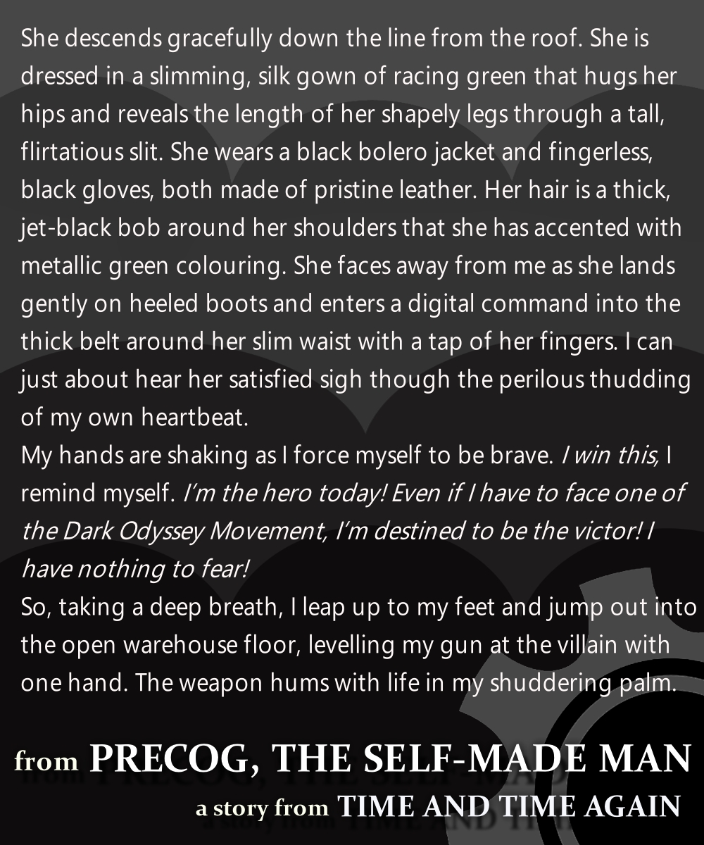 - Precog, the Self-Made Man (scifi, 9,000 words). A novice superhero seeks to take down his first villain, and he receives help from an unexpected source.