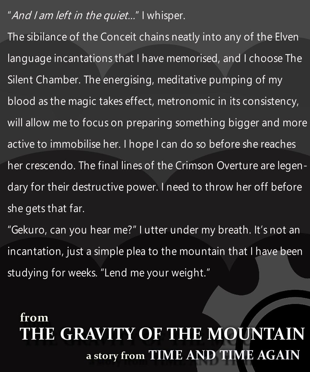 - The Gravity of the Mountain (fantasy, 9,500 words). Two mages battle atop a mountain. To the victor go the spoils.