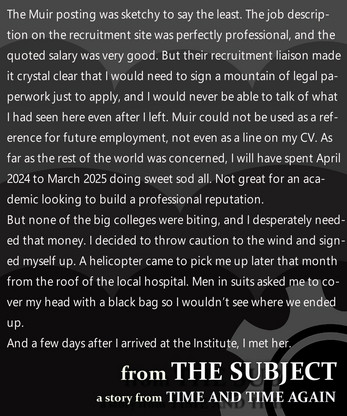 - The Subject (scifi, 7,100 words.) An enigmatic alien escapes her enclosure and hunts her handler in the institute corridors.