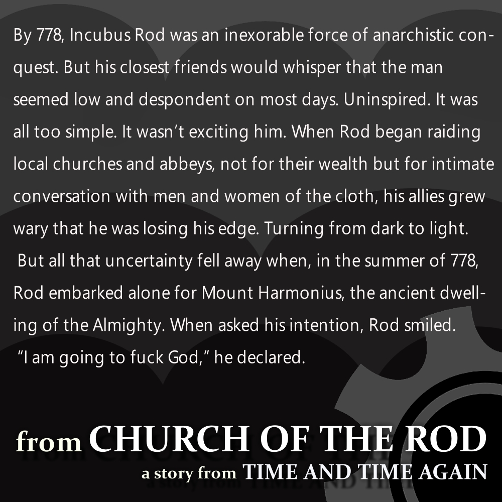 - Church of the Rod (fantasy, 5,400 words.) A cleric faces off against his first vampire with an unconventional set of tools.