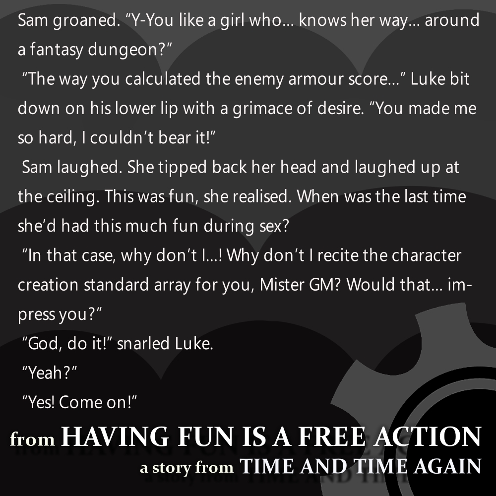 - Having Fun is a Free Action (modern, 7,500 words.) Sam has been asked to attend her brother's roleplaying game, and she goes to great lengths to keep her borrowed character from perishing.